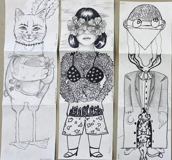 Have you ever played the game, an exquisite corpse? You might not know the name, but it was where you had a long strip of paper folded up and each person got to draw one bit of a body without necessarily knowing what had come before, and definitely without knowing what would come afterwards. The best thing about this game was that it created something suprising, and it was a way to do something collaborative. The idea was never to ruin someone else’s drawing, but to create something at least as good.